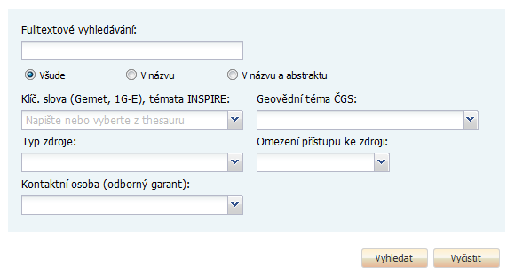 Pro přihlášeného uživatele se zobrazí rozšířený formulář. Kritéria vyhledávání vycházejí z povinných položek katalogové služby, z INSPIRE a potřeb ČGS.